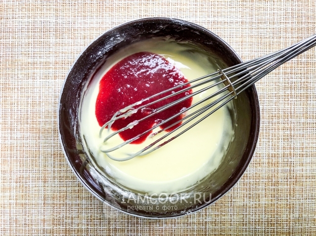 Далее влейте небольшое количество горячего пюре, непрерывно перемешивая венчиком.