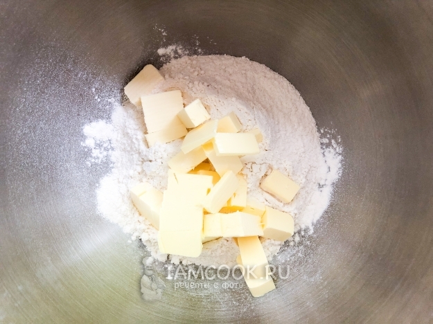 Просейте в глубокую миску муку, добавьте щепотку соли и холодное сливочное масло, порезанное кубиками. Далее необходимо это все перетереть в крошку. Я это делаю миксером, насадкой "весло", но можно и руками.