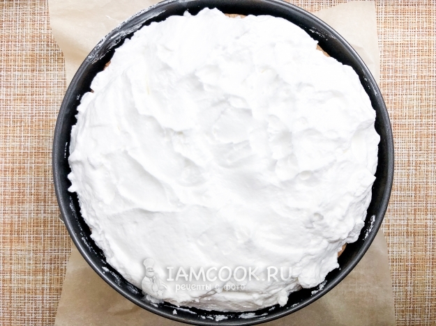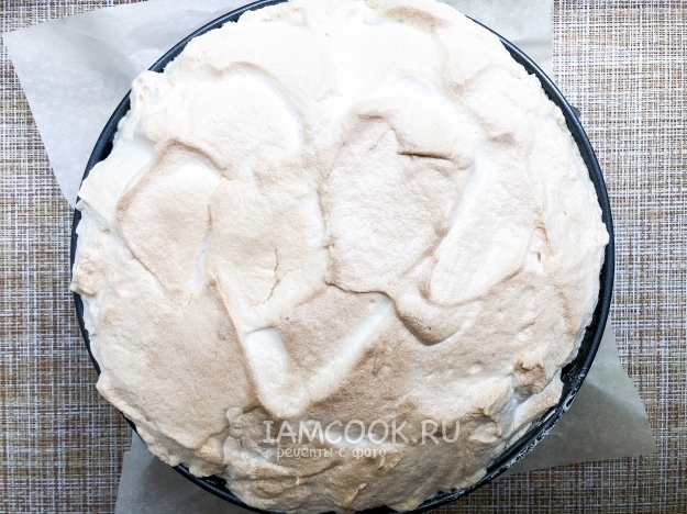 Выложите белковую массу поверх малинового крема и запекайте еще 15 минут при температуре 180 градусов.
