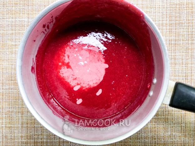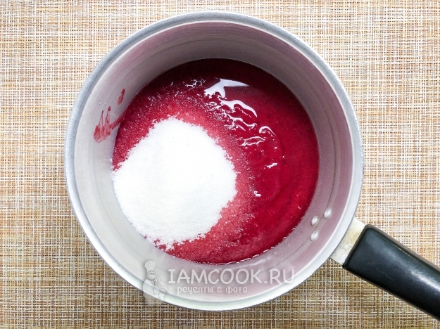Малиновое пюре соедините в сотейнике с сахаром (130 г) и выжмите сок половины лимона. Поставьте на маленький огонь и нагрейте, чтобы сахар растворился. Постоянно помешивайте.