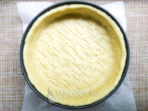 Форму для выпечки застелите пергаментной бумагой и руками распределите тесто по форме. Сформируйте бортики высотой 3-4 сантиметра. Наколите тесто вилкой. Выпекайте в духовке при температуре 180 градусов 20-30 минут, до золотистой корочки.