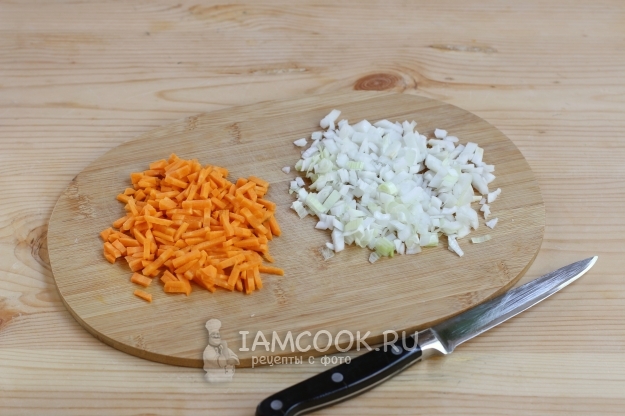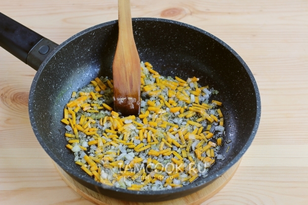 Спассеруем их до прозрачности на растительном масле в сковороде.