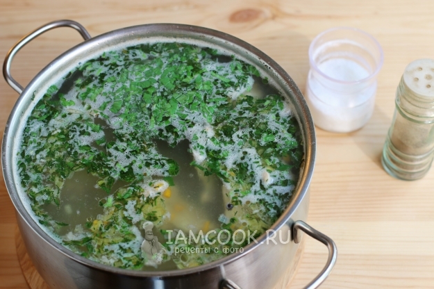 Когда рис с картофелем будут готовы, добавляем в суп пассерованные овощи с растолченной в пюре целой картофелиной, отваренной ранее. Также добавим в суп измельченную зелень и приправим окончательно по вкусу солью и перцем. Через минуту снимаем кастрюлю с огня и дадим супу минут 20 настояться.