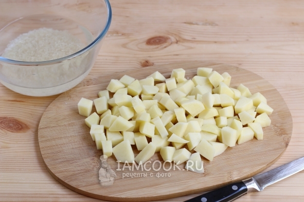 Остальной картофель нарежем кубиком, рис промоем несколько раз, пока вода не станет прозрачной.