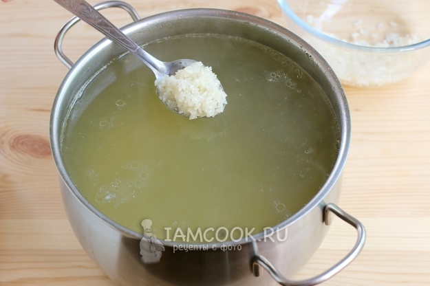 Сваренную картофелину уберем из бульона, проверим мясо на готовность, проткнув его ножом. Если мягкое, то добавляем в бульон рис.