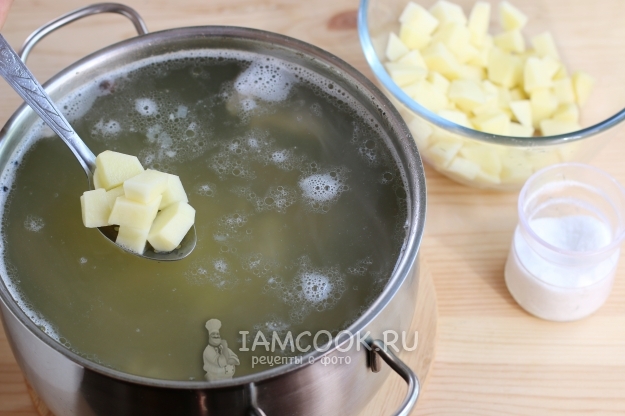 Через пять минут после добавления риса добавляем в бульон картофель и соль. Варим суп до готовности риса и картофеля.
