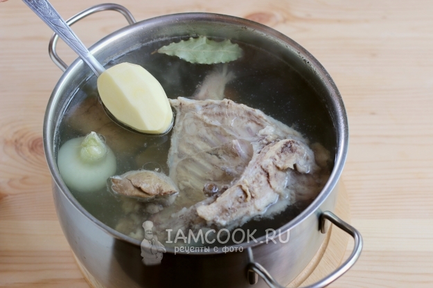 Через полчаса варки бульона положим в него одну очищенную картофелину и лавровый лист.
