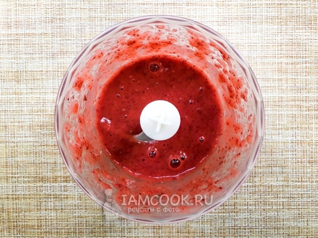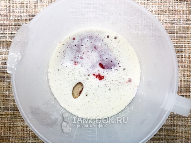 Добавьте молоко, подсолнечное масло и клубничное пюре. Взбейте до однородной консистенции.