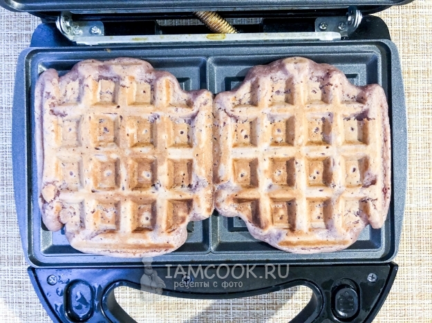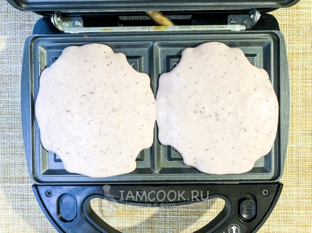 Разогрейте вафельницу, смажьте панели подсолнечным маслом и выложите тесто. Готовьте 10 минут.