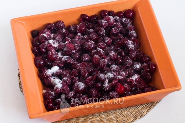Вишню положите в форму для запекания, посыпьте 1 ст.л. сахара и поставьте в разогретую до 180 градусов духовку на 15 минут. Остудите вишню.
