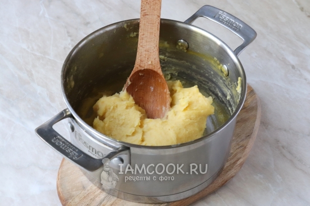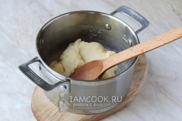 Не снимая с огня, интенсивно помешивая деревянной ложкой или лопаткой, заварим тесто. Оно должно собраться в один комок и начать отходить от стенок кастрюли (как на фото).