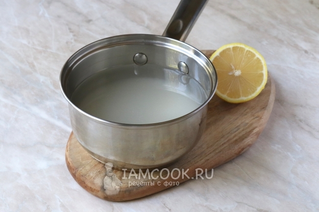 Для начала сварим сахарный сироп. Для этого в небольшой сотейник нальем воду (500 мл), выдавим сок половины лимона и добавим сахарный песок. Перемешаем и отправим на огонь. Доведём содержимое варочной ёмкости до кипения и будем варить сироп на минимальном нагреве 10 минут, до полного растворения сладких кристаллов. После чего отставим в сторону, чтобы остывал.