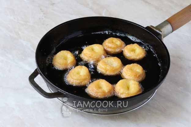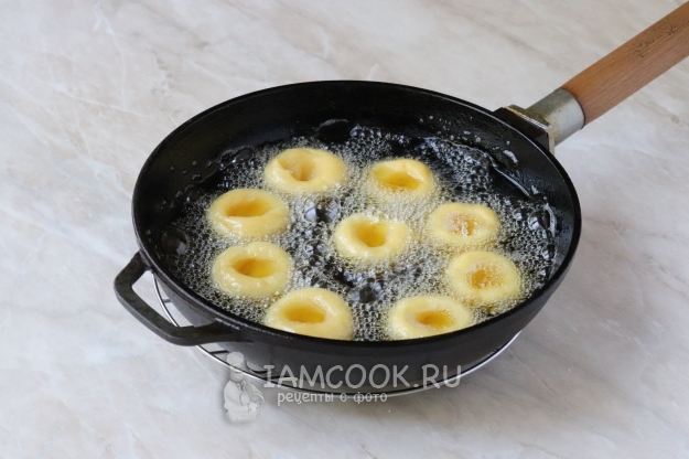 Тем временем подготовим фритюр. Можно воспользоваться специальным или же налить достаточное количество растительного масла в небольшую посудину (в моём случае - сковорода). Раскалим его и выложим заготовки.