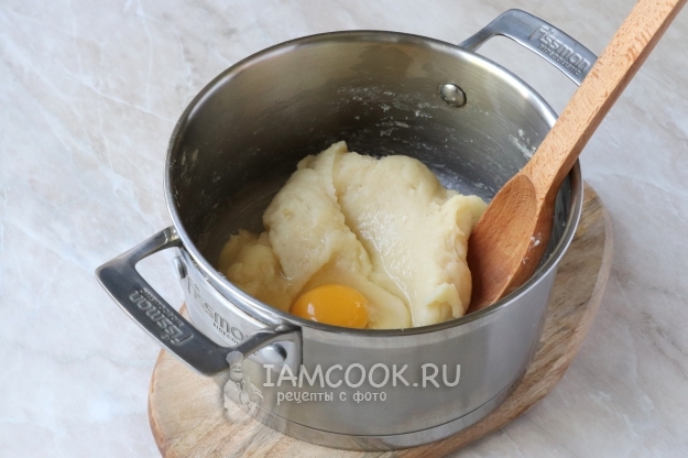 После чего дадим ему немного остыть и по одному введём куриные яйца. Каждый раз тщательно перемешивая, будто втирая их в мучную массу.