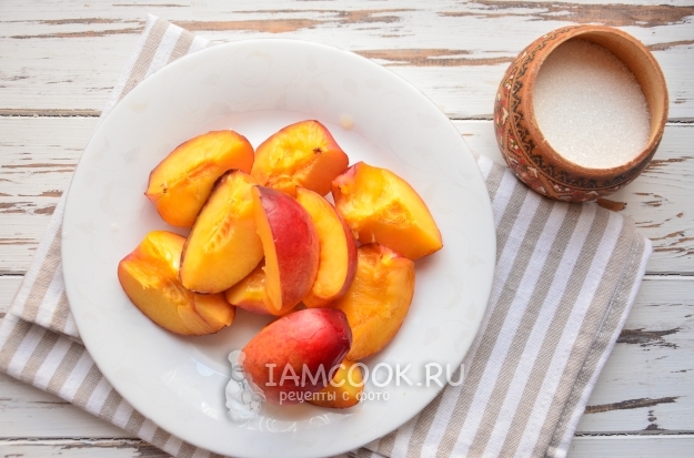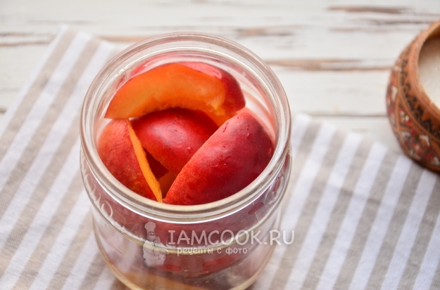 Уложите дольки нектаринов в чистые стерильные банки. Попутно банки нужно встряхивать, чтобы кусочки укладывались более компактно.