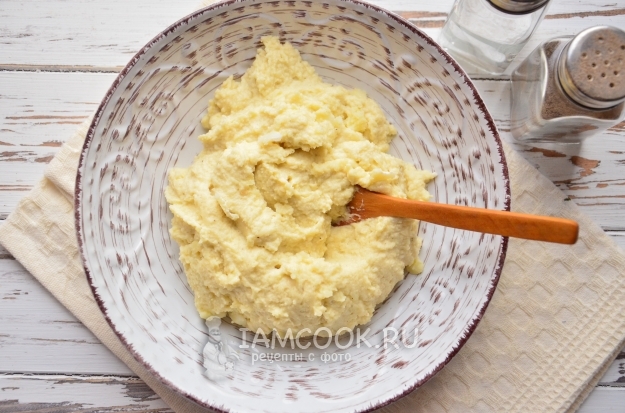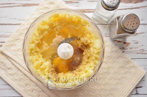 К измельченному картофелю добавьте соль и специи, а также вбейте свежее куриное яйцо. Снова все перемешайте.