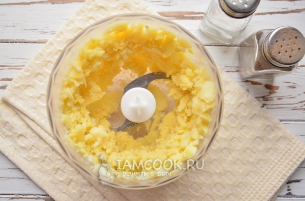 Вареный картофель можно сложить в чашу блендера и измельчить на небольшой скорости. Также можно хорошенько размять картофель вилкой.