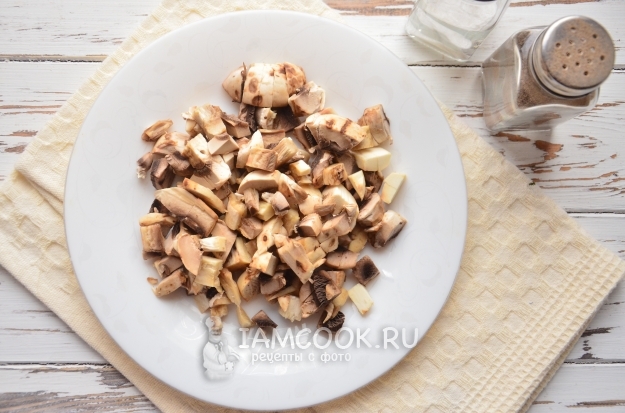 Шампиньоны помойте и при необходимости почистите. Затем мелко нарежьте. Также можно использовать и замороженные грибы.