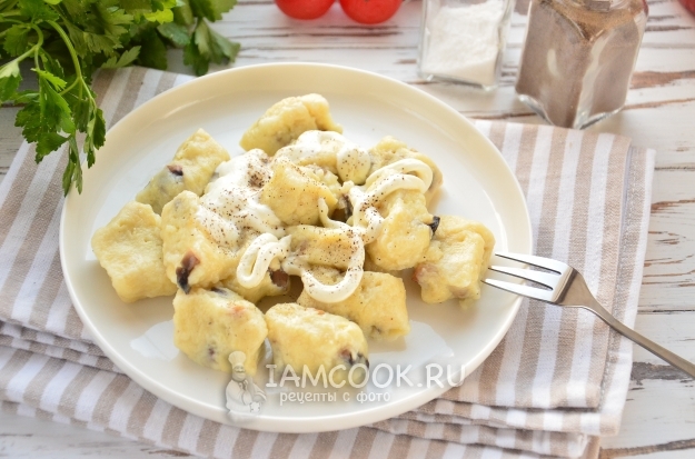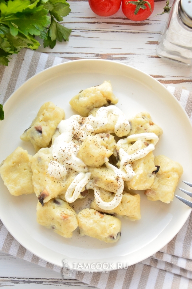 Ленивые вареники с грибами готовы. Подавайте со сметаной. Приятного аппетита!
