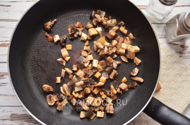 На сковороде разогрейте пару ложек масла для жарки. Переложите на раскаленную поверхность грибы и обжаривайте их в течение 5-6 минут на слабом огне. Можно их слегка подсолить.