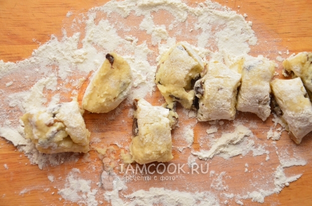 Все хорошенько перемешайте. Рабочую поверхность присыпьте пшеничной мукой. Разложите небольшую порцию теста на доске, раскатайте в жгут и нарежьте на небольшие кусочки.