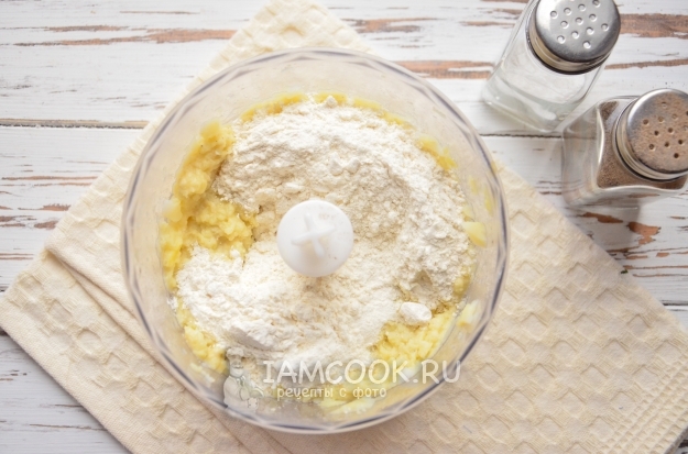 Теперь добавьте к картофелю просеянную пшеничную муку и перемешайте еще раз.