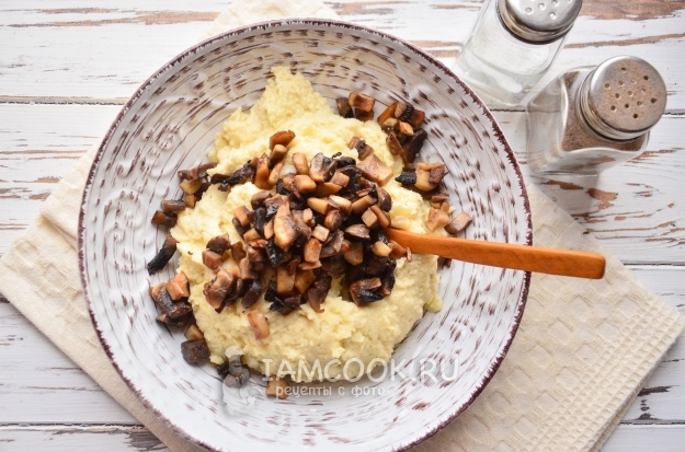 В миску с картофельной массой переложите обжаренные шампиньоны.
