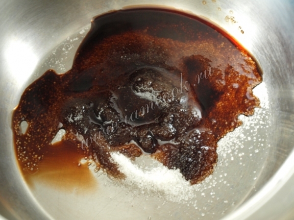 В сотейнике смешать бальзамический уксус и сахар, выпаривать на медленном огне, не допуская карамелизации, 10-12 минут.