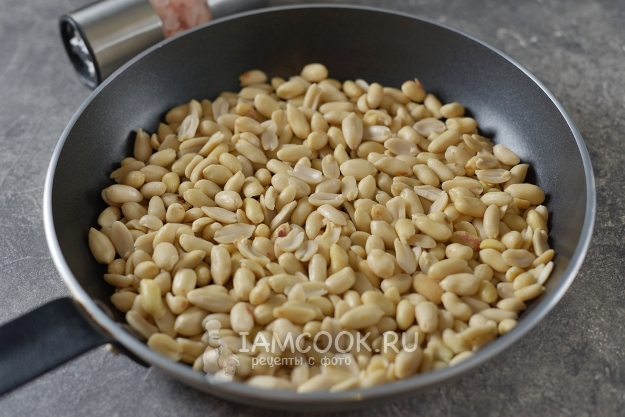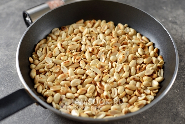 Разогрейте сковороду, выложите в нее арахис. Отходить от плиты теперь нельзя. Помешивайте орехи так часто, как только сможете. Если умеете, подкидывайте их на сковороде, держа ее за ручку.