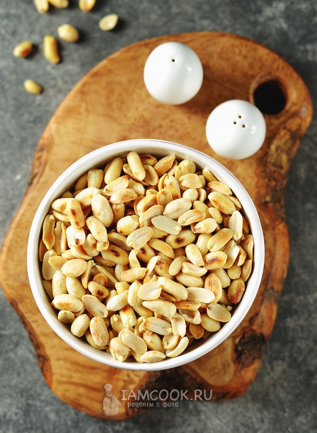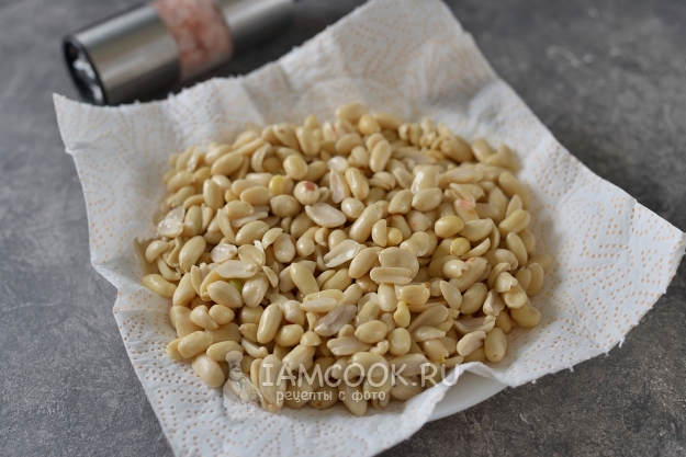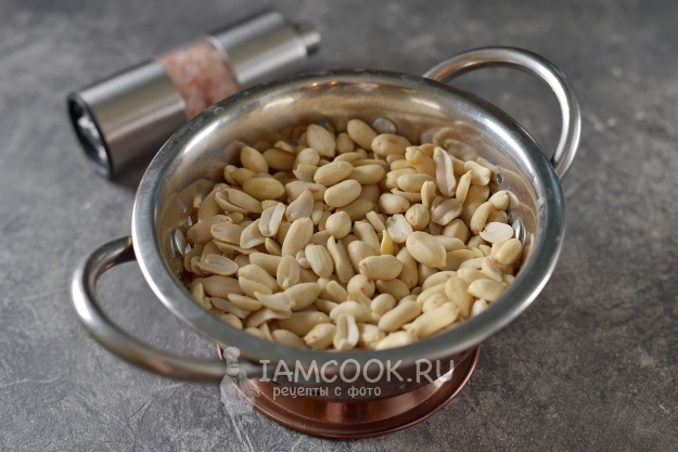 Подготовьте продукты для приготовления жареного арахиса на сковороде без масла. Очищенный арахис должен быть ровного белого цвета, без темных пятен и признаков порчи.