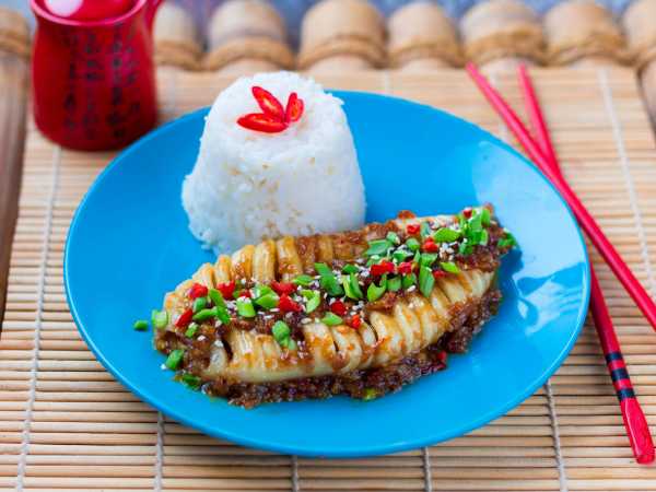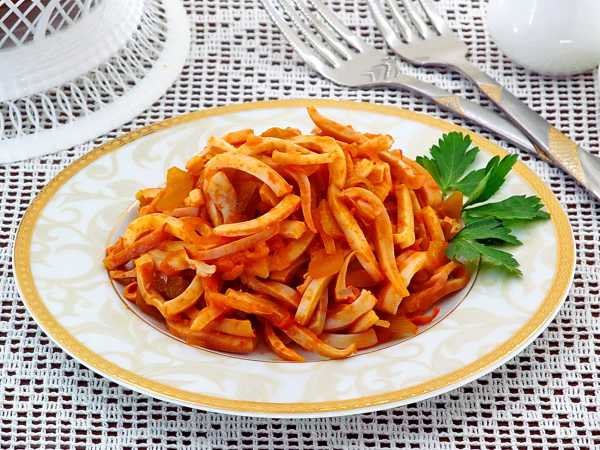 Режем осьминога на куски «на один укус». Имейте в виду, что в пимпочке тела осьминога может быть горячая вода. Так что, во-первых, подберите себе доску, с которой эта жидкость не зальёт стол, а во-вторых, осторожно, не обожгитесь.