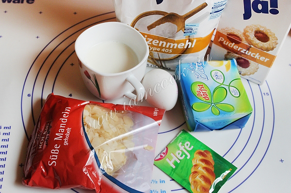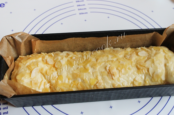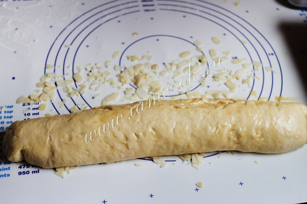 Пласт свернем в рулет. Смажем его взбитым яйцом. Насыпаем немного миндаля и обваливаем одну сторону рулета. Точно так же делаем с другой стороной. Нам нужно чтобы рулет был со всех сторон в лепестках.