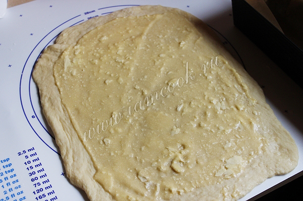 Делаем начинку, пока тесто поднимается. Разотрем мягкое масло и добавим все остальные продукты. Хорошо размешаем. Тесто подошло. Раскатаем в пласт и намажем нашей начинкой не доходя до краев.