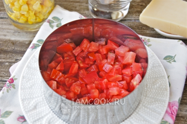 Для начала вымойте и нарежьте на небольшие кусочки помидор, откиньте его на дуршлаг, чтобы стек лишний сок. Если пропустить этот шаг, салат потечет и внешний вид будет испорчен.