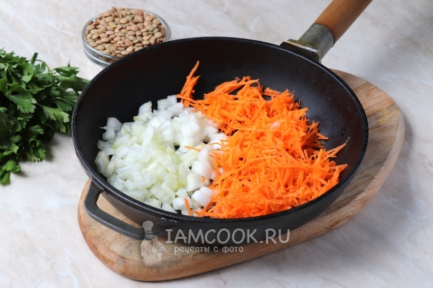 Очистим и помоем под проточной водой лук с морковкой. Лук нарежем средними кубиками, морковь натрем на терке. Овощную нарезку отправим на сковороду с растительным маслом. Обжарим на небольшом огне, периодически помешивая, до золотистого цвета, около 5 минут.