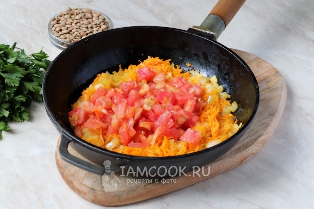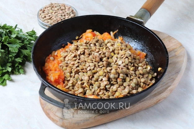 Зеленую чечевицу промоем несколько раз водою и переложим в овощную смесь. Перемешаем и, по надобности, добавим ещё специй.