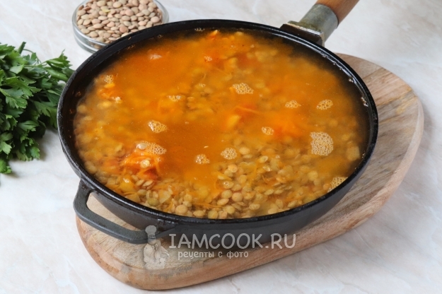 Доведём жидкость до кипения. Снизим огонь до минимального, накроем варочную ёмкость крышкой и будем варить чечевицу 25-30 минут, до мягкости зёрен.