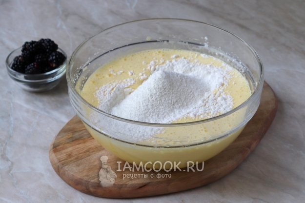После чего введите просеянную пшеничную муку и разрыхлитель.