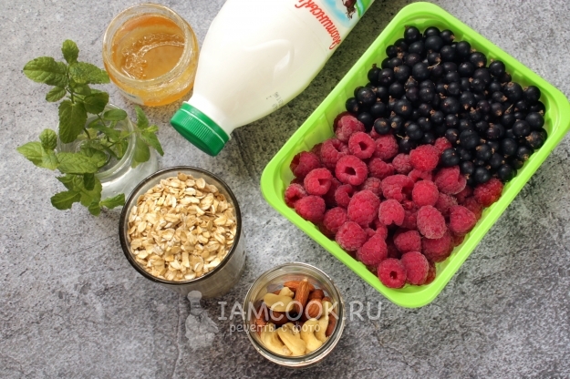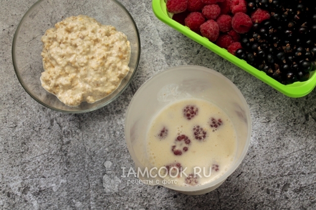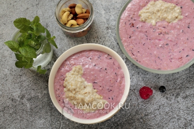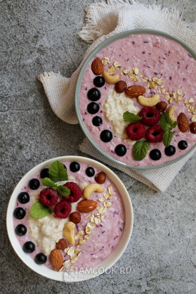 Подобно овсянке в банке и питьевым смузи, эту смесь варить не нужно. Заливаете хлопья молочным, кисломолочным напитком или соком, измельчаете до густой, устойчивой каши, подаете в тарелке/плошке с ложкой — сверху дополняете целыми ингредиентами. Красиво, вкусно и просто.