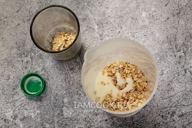 Геркулес заливаем кефиром и измельчаем. Если хлопья жесткие, требующие долгой варки, можно настоять некоторое время и дать разбухнуть.