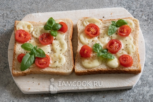 Посыпаем бутерброды с сыром и помидорами базиликом.