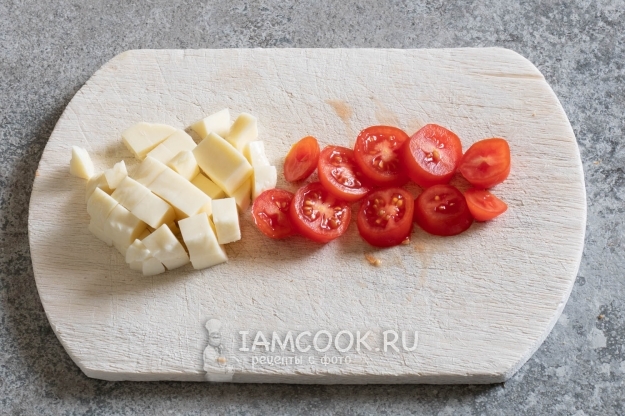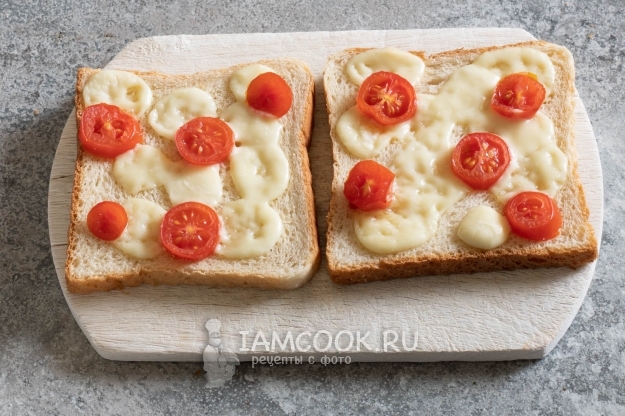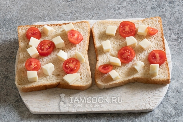 Выкладываем сыр и помидоры на куски белого хлеба, солим.