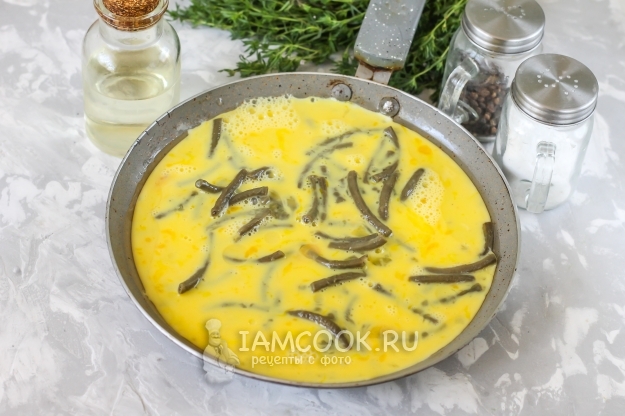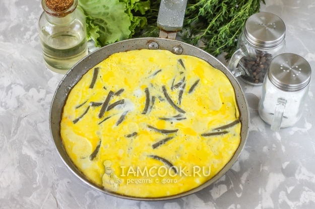 Раскалим сковороду, смажем ее растительным или топленым сливочным маслом, чтобы омлет не пригорел. Откинем чесночные стрелки на дуршлаг и нарежем на части. Добавим на сковороду и поджарим в течение 1 минуты на среднем нагреве. Затем зальем яичной массой и убавим нагрев до минимального. Накроем сковороду крышкой и протомим блюдо около 3 минут до полной готовности.