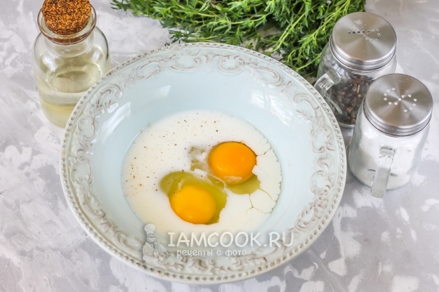 Вобьем куриные яйца в глубокую емкость, нальем туда же молоко, посолим и поперчим. Тщательно взобьем в течение 2-3 минут до пышной пены.