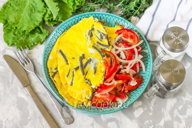 Выложите омлет с чесночными стрелками из сковороды на тарелку и подайте с овощным салатом, колбасой, отварным мясом и т.д.