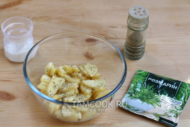 Картофель перекладываем в миску, добавляем соль, перец и розмарин. Перемешаем.