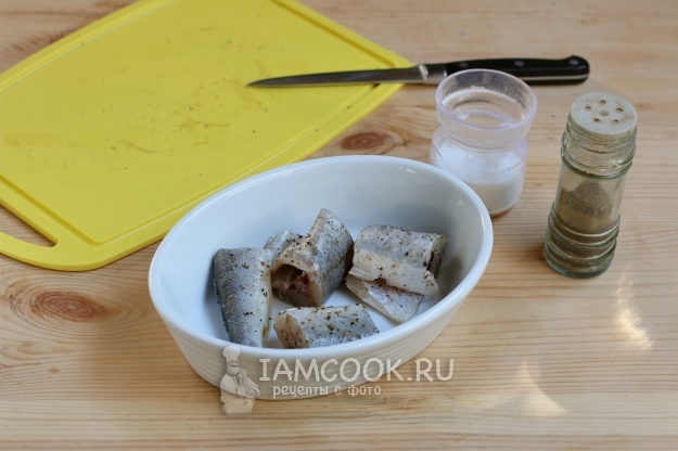 Складываем кусочки рыбы в форму, в которой будем ее запекать вместе с картофелем, смазав форму перед этим растительным маслом. Приправим солью и перцем.