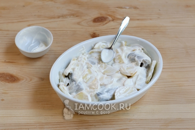 Сверху смазываем сметаной. Сметана даст сочности блюду. Ставим форму в разогретую духовку и запекаем навагу с картошкой в духовке при 180 градусах около 30 минут.