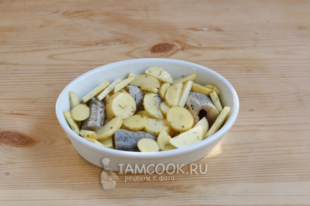 Через указанное время проверим готовность картофеля, проткнув его ножом. Если картофель мягкий, можно смело доставать блюдо из духовки, ведь рыба за это время точно приготовилась.