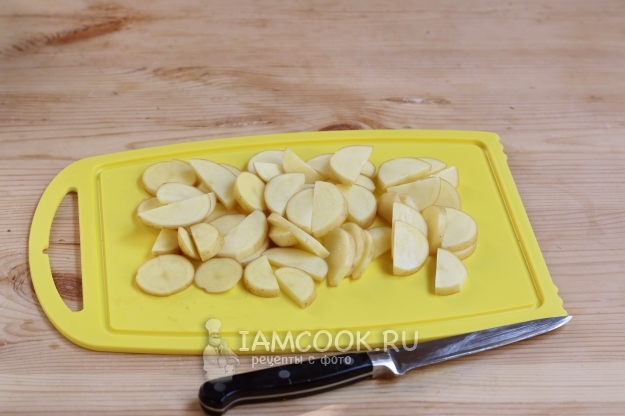 Молодой картофель можно готовить даже с кожурой, ведь она очень тонкая, главное, его просто хорошо помыть под водой. Если не хотите с кожурой, просто счистите кожуру ножом. Нарежем картофель тонкими кружочками, а потом кружочки - еще пополам, чтобы получились небольшие дольки.